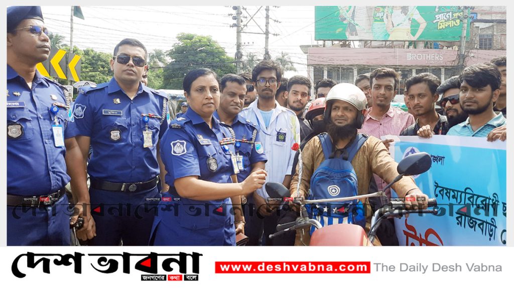 রাজবাড়ীতে যথাযথভাবে ট্রাফিক আইন মেনে মাথায় হেলমেট ব্যবহার করে সড়কে মোটরসাইকেল চালানোর জন্য চালক ও আরোহীকে ফুলেল শুভেচ্ছা জানিয়েছেন নবাগত পুলিশ সুপার শামিমা পারভীন।