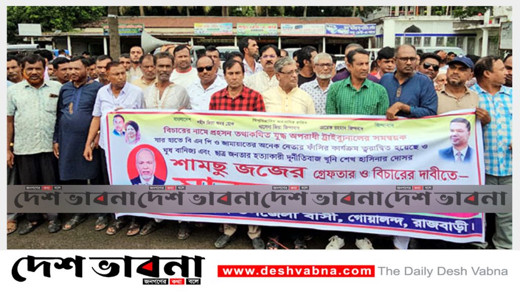 রাজবাড়ীর গোয়ালন্দ উপজেলাতে বিচারের নামে প্রহসন, তথাকথিত যুদ্ধ অপরাধী ট্রাইব্যুনালের সমন্বয়ক অবসরপ্রাপ্ত জজ মো: শামছুল হক’কে গ্রেফতার ও বিচারের দাবিতে মানববন্ধন কর্মসূচি পালিত হয়েছে।