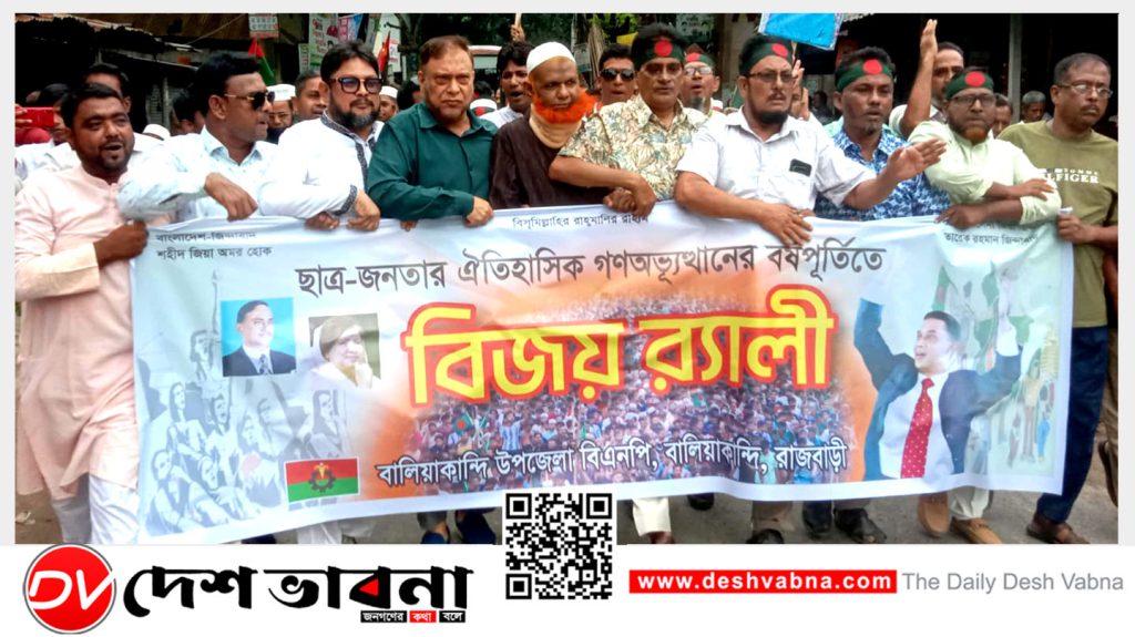 ছাত্র জনতার ঐতিহাসিক গণঅভ্যুত্থানের বর্ষপূর্তি উপলক্ষে রাজবাড়ীর বালিয়াকান্দি উপজেলা বিএনপির উদ্যোগে বিজয় র্যালি ও সমাবেশ অনুষ্ঠিত হয়েছে।